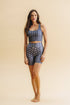 Bermuda com cós largo e alto, modelagem ampla com elástico na cintura, em tecido soft com leve brilho acetinado com estampa exclusiva.